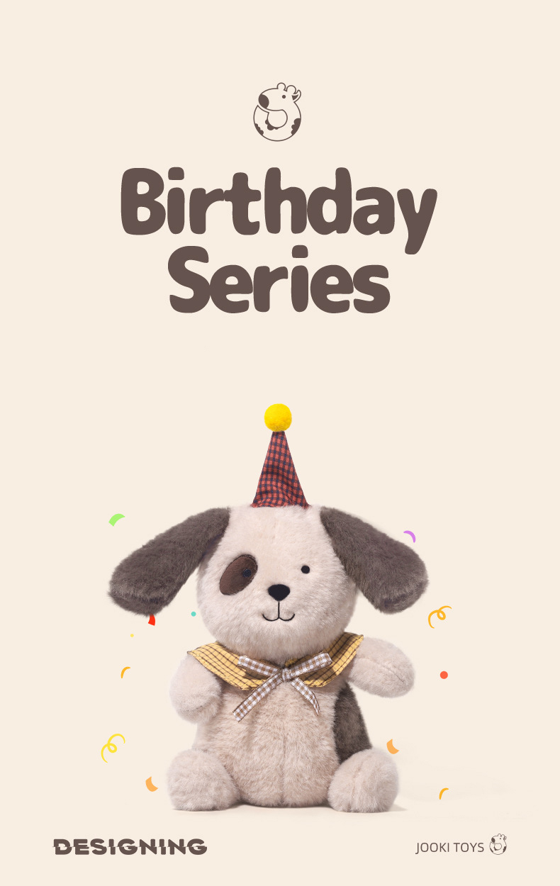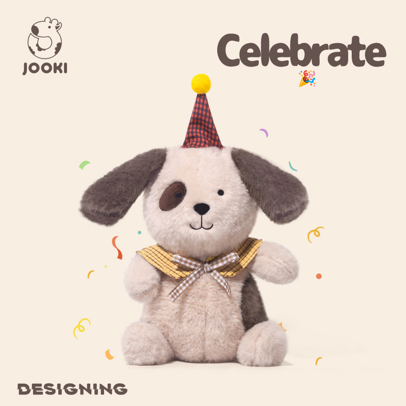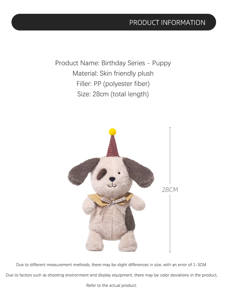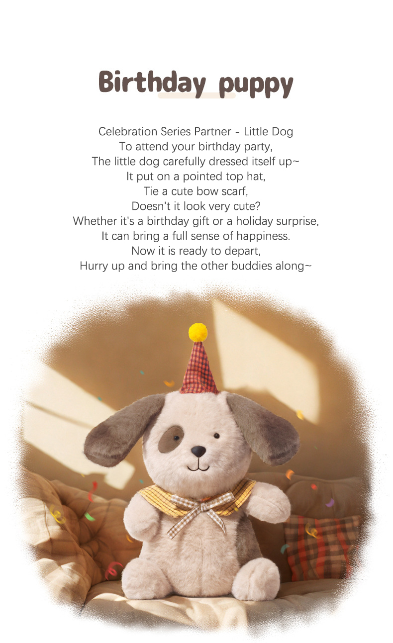 This festive plush puppy comes dressed in a birthday hat with extra-fluffy ears and sparkling eyes! Made with premium short plush fabric and hypoallergenic PP cotton filling – perfect for kids 3+ to cuddle and cherish.